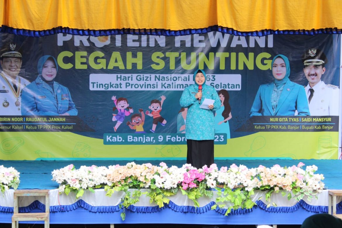 Ketua TP PKK Kalsel Hj. Raudatul Jannah mengajak untuk sama-sama mencegah stunting dengan konsumsi protein hewani dan juga menjelaskan apa isi piringku dalam gizi seimbang.